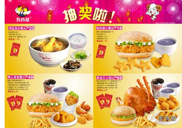 麦肯基新年套餐够丰富够优惠,1-3人多种选择,点新年套餐就抽奖。红包奖项多多,打开见惊喜,代金券、免费小食券、现金……席卷而来。